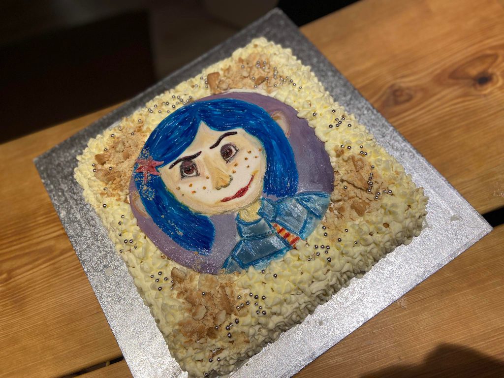 Küpsise-kohupiimatort. Pilt martsipanile maalitud